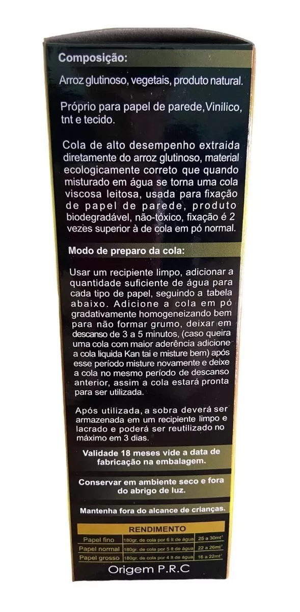 Cola de alto desempenho extraída diretamente do arroz glutinoso, material ecologicamente correto que quando misturado em água se torna uma cola viscosa leitosa, usada para fixação de papel de parede. Fixação 2 vezes superior à cola em pó normal. Rendimento: Papel fino | 180g. de cola por 6L de água | 25m² a 30m² Papel normal | 180g. de cola por 5L de água | 22m² a 26m² Papel grosso | 180g. de cola por 4L de água| 16m² a 22m²